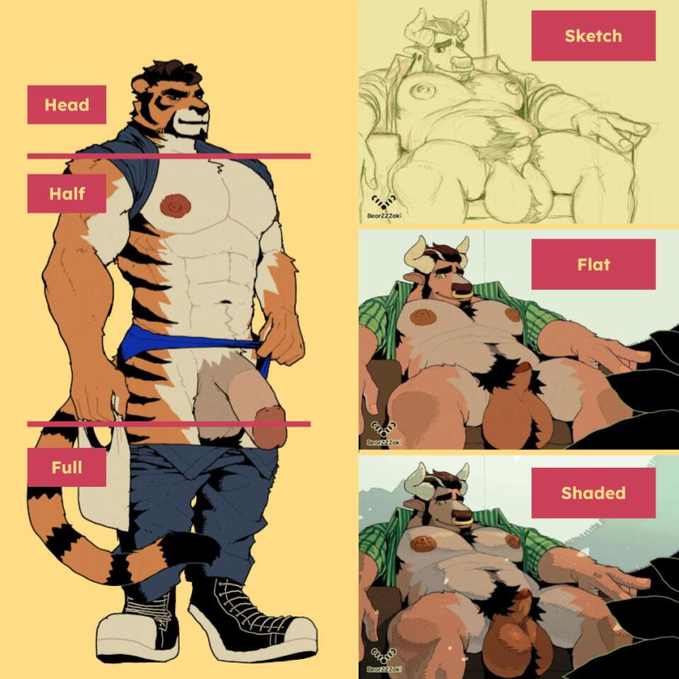 I offer illustration commissions for furry, bara, and NSFW-friendly content. From solo portraits to complex fetish scenes, you set the vibe~~~You’ll get: